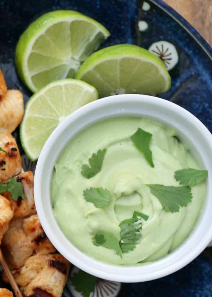 - Place avocado, yogurt, garlic, and lime juice in a blender (or a bullet due to it’s smaller size). Process until completely smooth.