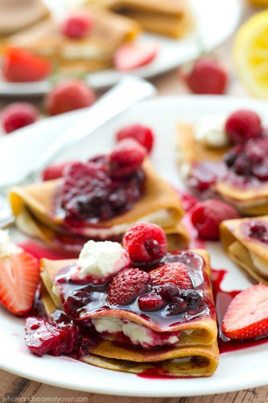 Spread half of the cream cheese mixture on one side of the crepe. - Spread half of the berries on top of the cream cheese.