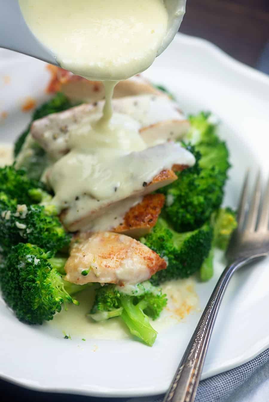- To serve, divide the broccoli between four plates and top with chicken. Drizzle with sauce.