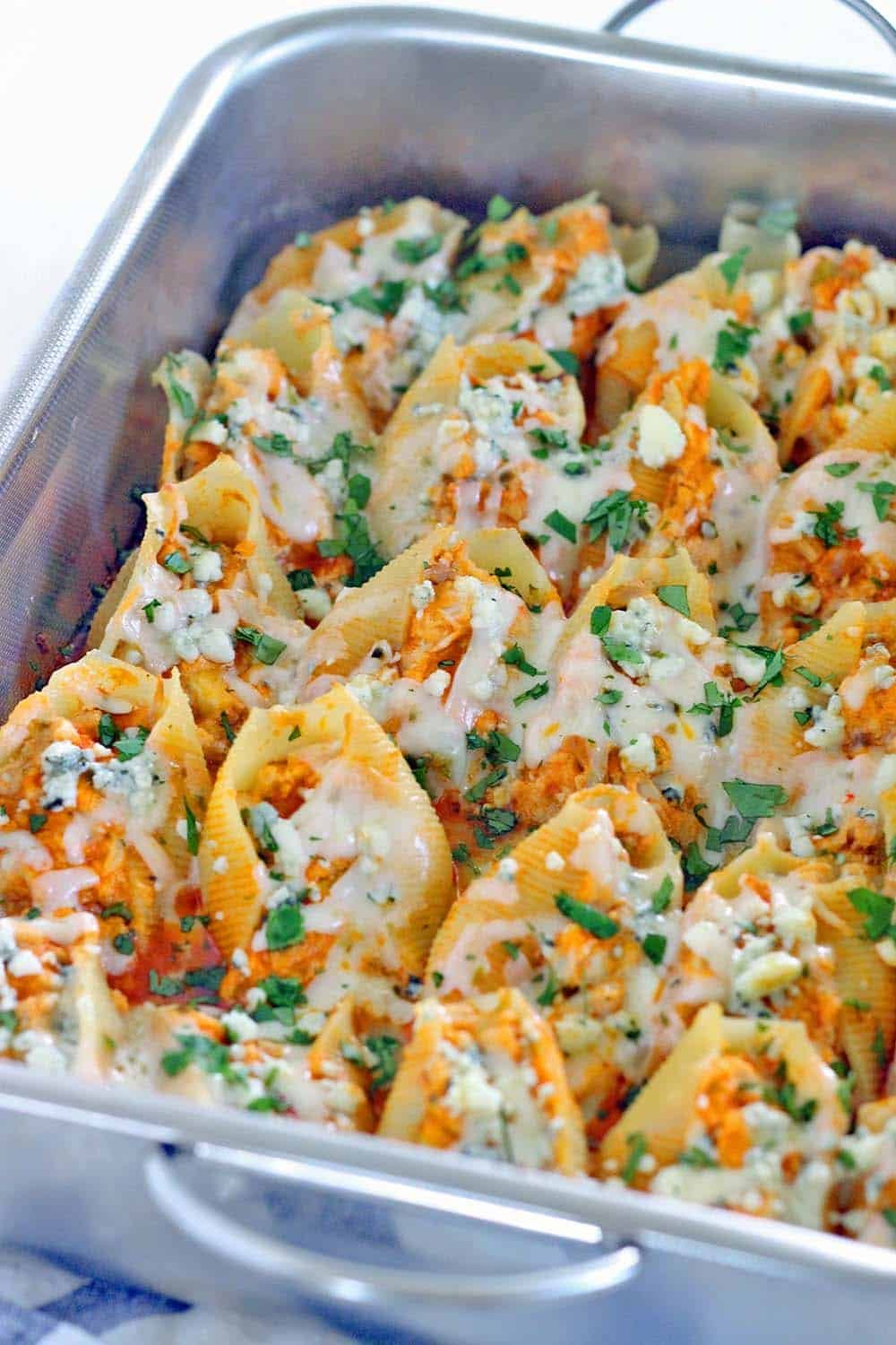 - Spoon chicken mixture into cooked pasta shells and arrange into the prepared baking dish. Sprinkle Cheddar-Monterey Jack cheese blend over the stuffed shells; season with salt and pepper.