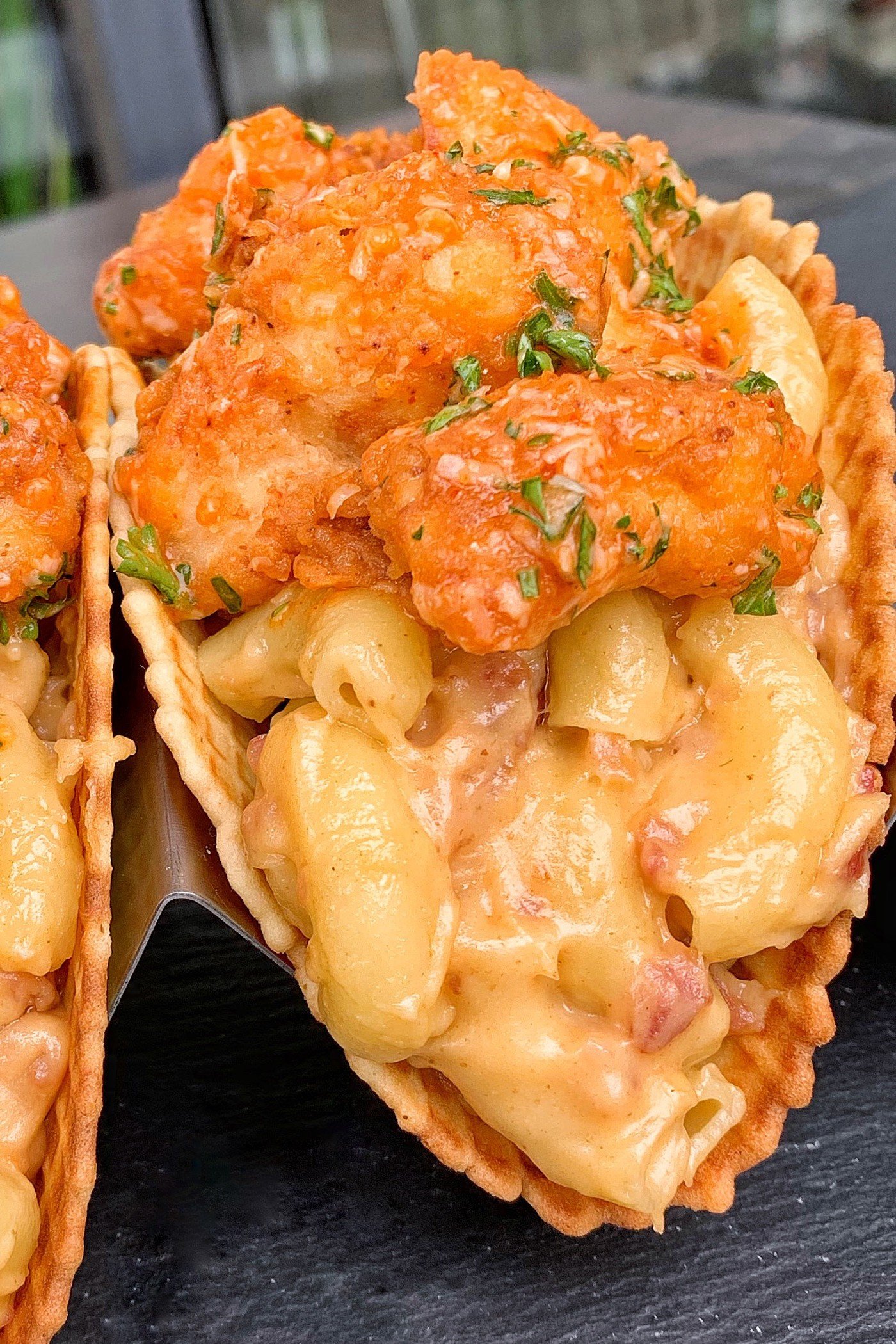 - Add the mac n cheese to the base of the waffles. Top with fried chicken and garnish with extra parsley. Enjoy!