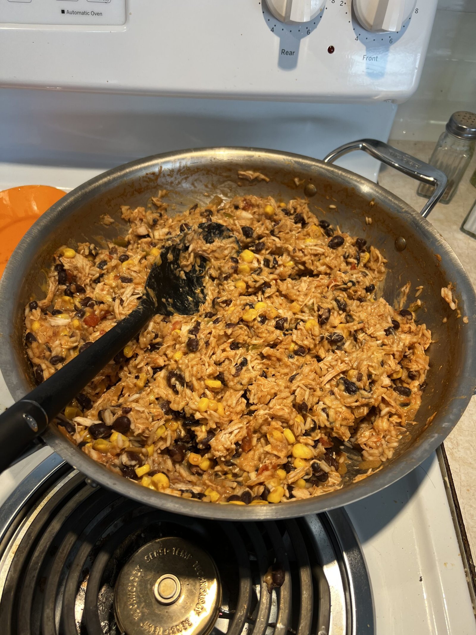 - In a large skillet, combine the rice, salsa, chicken, black beans (drained), corn, chili powder, and chicken broth. Stir until everything is evenly combined.