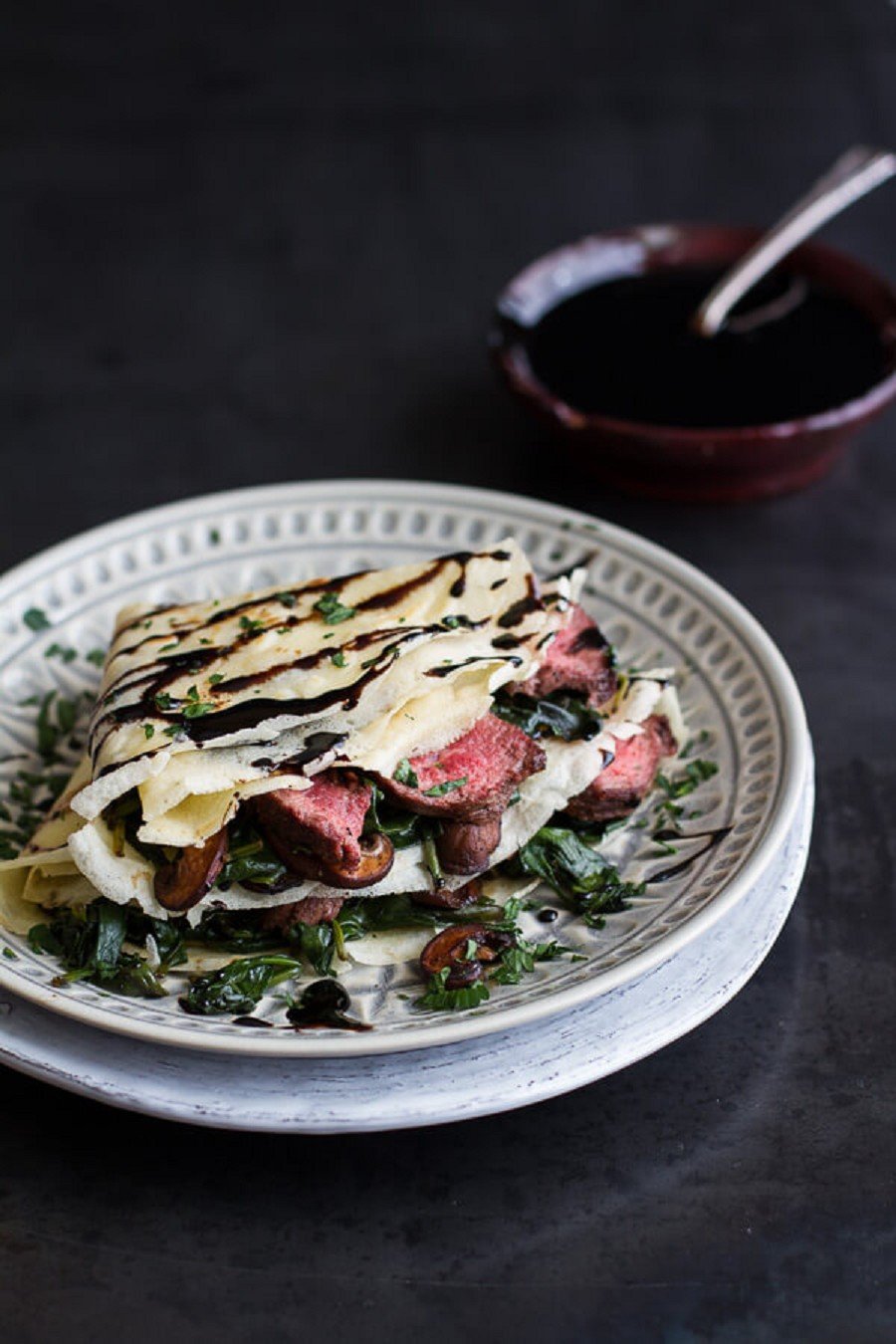 - To assemble, layer a crepe flat on a plate and sprinkle on the spinach and mushrooms. Add a few slices of steak and a sprinkle of blue cheese. Fold the crepe up into triangles or little burritos. Drizzle with the balsamic glaze and add a dollop of blue cheese butter if desired. Sprinkle with fresh parsley. YUM.